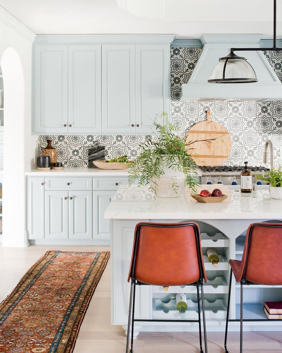 This almost-white blue extends from cabinets to island and pairs well with black and white tile and leather seating. Design by Kate Lester of Kate Lester Interiors & Kate Lester HOME in Southern California.